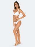Luli Fama Swimwear Orillas Del Mar Seamless Ruched Back Brazilian Bikini Bottom in White. Ribbed Adjustable Tie side bikini bottom with wavey detailing at the rear with shirring down the center. Reversible. Seamless